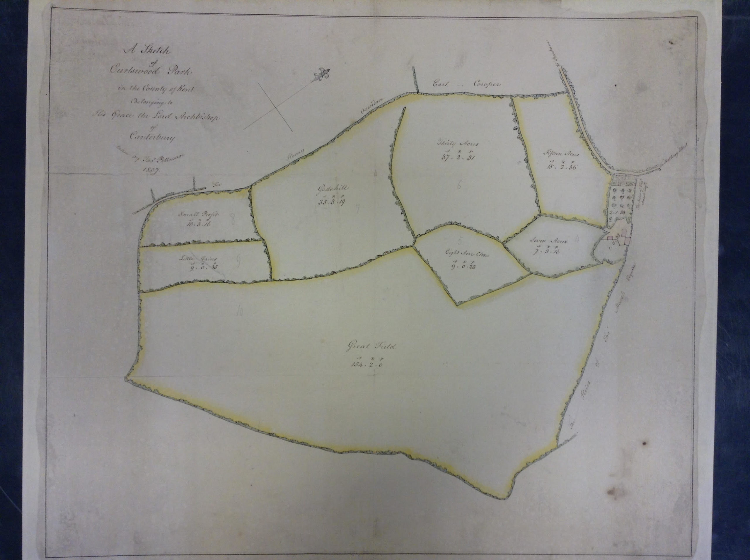 A survey of the Archbishopric of Canterbury’s lands in 1617/18 recorded Curlswood as consisting of 60 acres of arable land and 180 acres of woodland with 1 acre of woodland grubbed up. Curlswood was noted to not be part of any manor and leased from Archbishop George Abbot by William Selby, with Pownall as under farmer or sub-tenant. The lessee was probably Sir William Selby, who had inherited Igtham Moat in 1611. The lease was on the same beneficial terms as contained in the previous two leases.