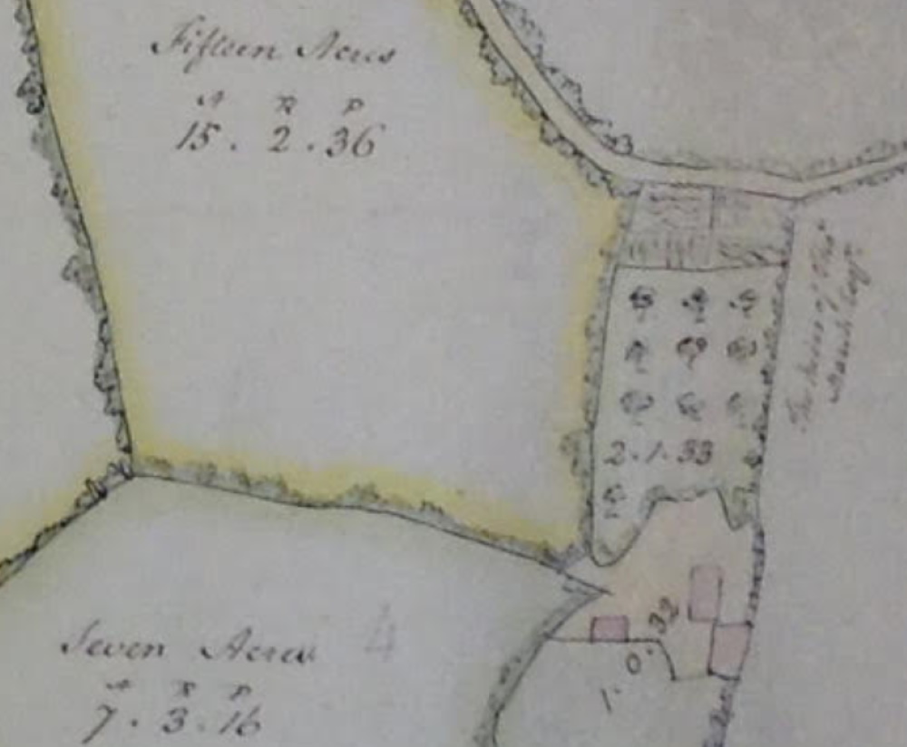 The 1758 lease refers to it as arable and pasture. Pasture would be the first use after the woodland was cleared. A possible reason for clearance could have been the sale of timber to the navy followed by use as grazing land and then arable as agricultural practices became more advanced and agriculture more profitable. The difference in acreage from the 240 acres at the time of the 1280’s survey to 280 acres in 1763 would be accounted for in the variations in the size of an acre over the centuries until measurements were standardised in the United Kingdom in the nineteenth century. The actual total of acreage recorded on the 1807 map adds up to a fraction of an acre over 284 acres in total, including the house and gardens.