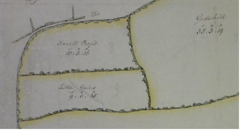 Curlswood Park had a boundary with the hamlet or vill’ of Ratling and may have been included in the vill’ in pre-Norman times. Ratling is said to derive its name from the Old English (O.E.). ryt hlinc; literally a rubbish slope, an area of little use for agriculture. Further evidence of the poor nature of the land within the park can be found on an 1807 map made by Thomas Pettman for the Charles Manners-Sutton, Archbishop of Canterbury., see below, which records the field enclosure names at the southern end of the park as “Small Profit” and “Little Gains”. These same names are recorded on the 1839 Nonington tithe and the 1859 Nonington Poor Law Commissioners maps. “Small Profit” and “Little Gains” are now covered for the large part by the Aylesham industrial estate between Spinney Lane and the B2046 Wingham Road.