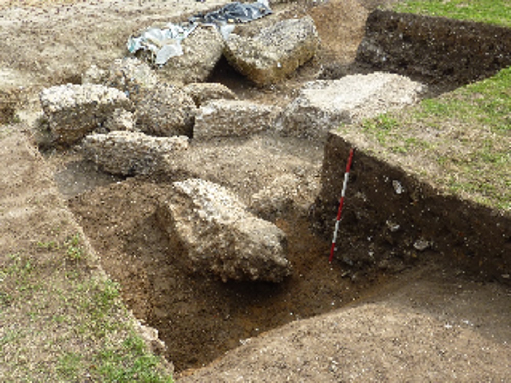 We are reaching the end of what we can do with the spade and trowel until everything has been mapped, drawn and photographed. There may then be some further checking by removing more wall to ascertain what may be underneath but the next stage is some trial trenches in other parts of the area to see what else we may find. For example, we suspect that we have yet to find the first home for our 13th and 14th Century bricks and most certainly we do not know where our big blocks of masonry come from (pictured). Not from the South, East or North we are pretty sure. So, go West young man.