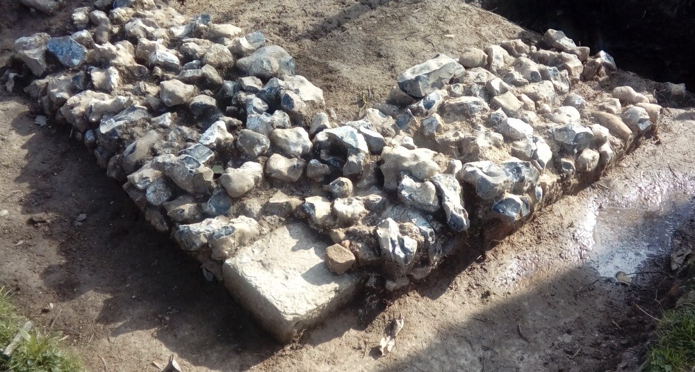 “We put in another trench to confirm the continuation to the North East of what we now believed to be a 1798 ditch and bank around Beauchamps Wood – which it did –but in so doing to our astonishment exposed another rectangular building just below ground level. Finely built with stone corners and knapped flint, the breadth of the walls suggested it was more than one storey high. Unlike our other buildings, there was no floor other than earth but the mix of flint with some tile and fragments of yellow brick was similar to the construction of one of the earlier buildings we had excavated on site. Too small to be domestic accommodation, we concluded that we had probably found the dovecot that was recorded on site in 1349 and again in 1360.