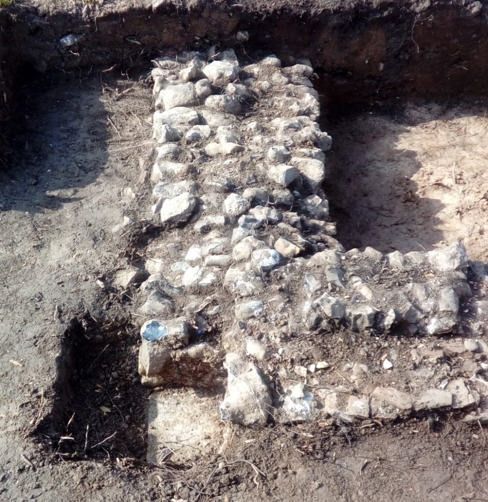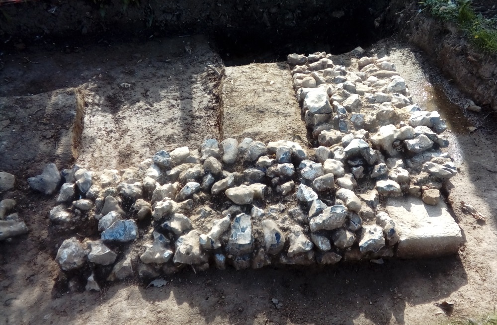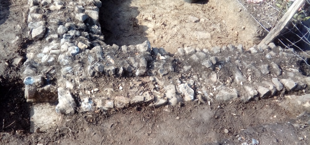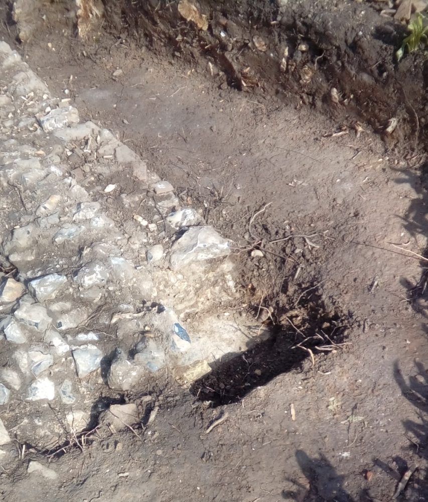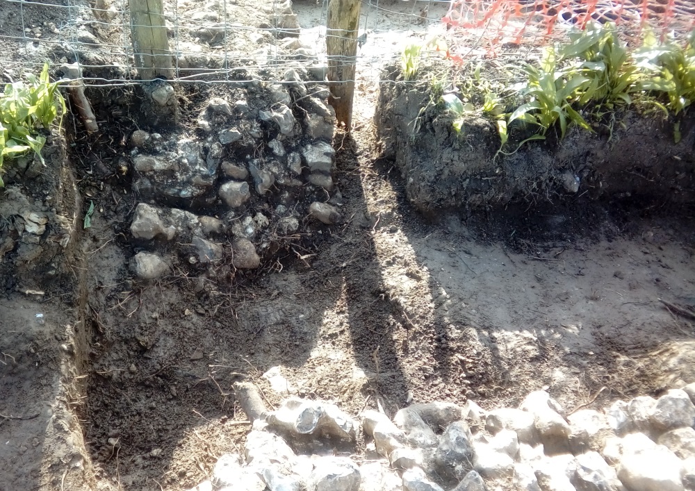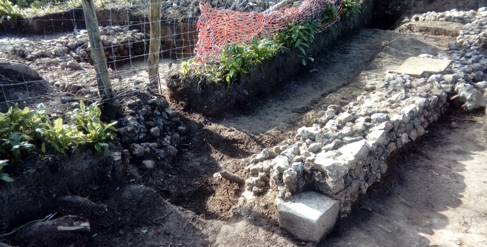 Of course, this discovery persuaded us to test whether the 1798 ditch, driven straight through the foundations of our probable dovecot, had also cut through the roadway into the site from the West that we had previously tentatively identified. Indeed it did but the excavations are revealing further walling again on a different axis to everything else we had as well as shallow piles of flint which are being investigated to see what, if anything, lies underneath. There are some weeks at least of work to try to bottom what may have been on this part of the site.