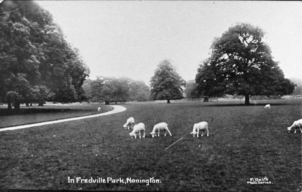 John Evans in “The Juvenil Tourist: Or Excussion Through Various Parts of the Island of Great Britain“, published in 1805, said of the house ““Fredville is neat and spacious—it has, together with the house, within these few years been not only enlarged but improved with taste and judgment. The Mansion, standing on a rising ground, has a handsome brick front, supported by six columns of the Corinthian order—the drawing-room- is truly elegant, and the library contains several thousand volumes, selected from the most approved ancient and modern authors. From the front of the house to the south, Barson [Barfreston] mills wave their swifts above the plantations, and on the north-west Nunnington mills [the Easole corn mill & feed mills] form a correspondent prospect. The swing suspended from the high branch of a towering oak—the rabbits skipping from hole to hole, formed among the fibres of the trees, and a rising family of hearty children seen amidst their innocent gambols constitute at once a piece of rural and delightful scenery. At the south-west end of the Mansion the Green-house has a pretty effect, displaying the skill of the Botanist whilst the industrious bees are observed conveying their plundered stores into glasses fixed within the windows of their abode, which in its turn is plundered to enrich the owner’s table! The gardens behind the house are encircled with a shrubbery, along which a green walk, defended by a light post and rail, presents us with a view of the surrounding country. The woods on the south [Broom Hill and Oxney Woods, the first is under the colliery tip, the view of the second is now obscured by the same tip],—the distant telegraph on the west [the Admiralty telegraph at Womenswold] , and the Isle of Thanet with Ramsgate harbour, &c. on the north-east, tend to enrich and diversify the prospect. The Bowling Green also hid among the trees—the laurelled-covered Ice-house, the sweet briar hedge and the weeping ash trees enhance the sensations of delight arising from the contemplation of this spot. In a word, should any thing be thought wanting, a stream of water would complete the situation”.